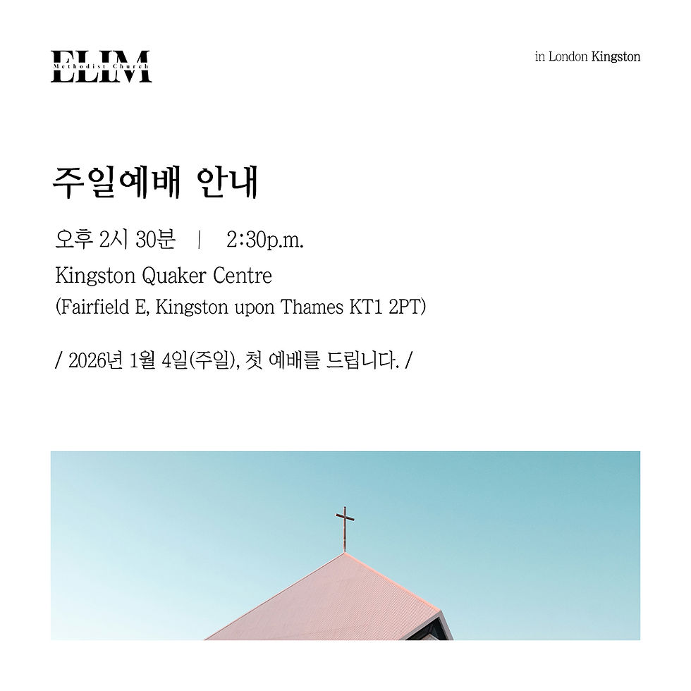 성경에 등장하는 ‘엘림’은 광야를 지나던 이스라엘 백성이 쉼과 회복을 경험했던 장소입니다. 런던엘림감리교회가 이 땅의 엘림이 되어, 지친 이들이 하나님 안에서 쉼과 회복을 누리고, 그 은혜를 다시 이웃과 나누는 공동체가 되기를 소망합니다.